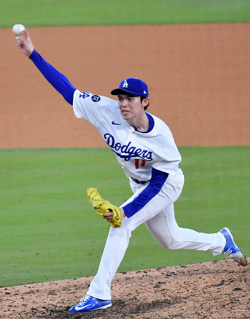 米大リーグのナ・リーグ優勝決定シリーズ第3戦はドジャースがブルワーズに3―1で勝って対戦成績を3勝0敗とし、2年連続リーグ優勝にあと1勝とした。写真はセーブを挙げた佐々木=16日、ロサンゼルス 【時事通信社】