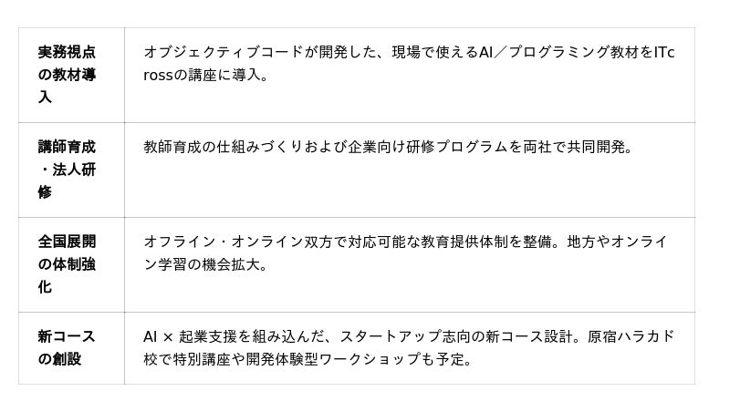 2025年9月29日、IT開発・AIコンサルティングを手掛ける株式会社オブジェクティブコード(東京都港区、代表取締役:溝口勇樹)は、AI教育・起業支援を手掛けるITcross株式会社(東京都渋谷区、代表取締役:菅井朝日)と、戦略提携を締結しました。これにより、より実践的で現場直結型のカリキュラムを含む教育プログラムを全国で展開し、AIリテラシーの底上げと起業支援の強化を図ります。教育の質を高めたいすべての人に、新たな学びの場を提供します。